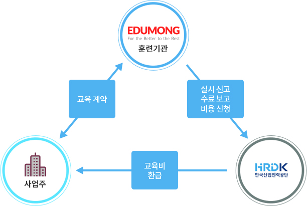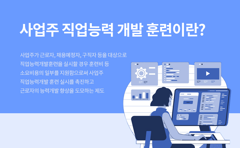 사업주가 근로자, 채용예정자, 구직자 등을 대상으로 직업능력개발훈련을 실시할 경우 훈련비 등 소요비용의 일부를 지원함으로써 사업주 직업능력개발 훈련 실시를 촉진하고 근로자의 능력개발 향상을 도모하는 제도